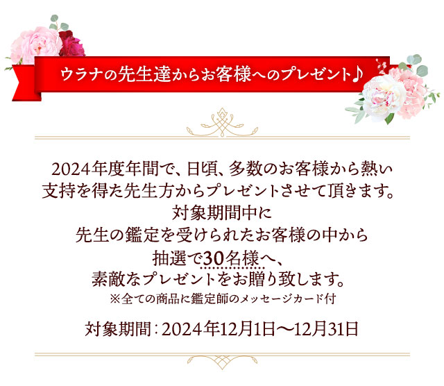 対象期間中に上記先生の鑑定を受けられたお客様の中から抽選で30名様にプレゼントを差し上げます。