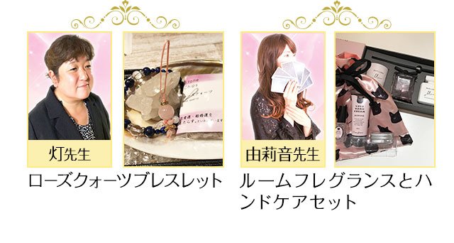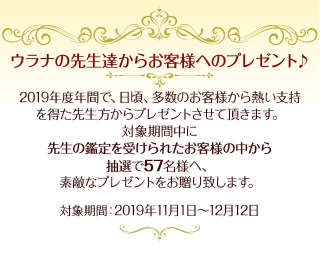 対象期間中に上記先生の鑑定を受けられたお客様の中から抽選で57名様にその先生からのプレゼントを差し上げます。
