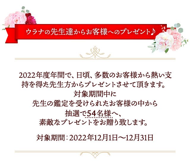 対象期間中に上記先生の鑑定を受けられたお客様の中から抽選で54名様にその先生からのプレゼントを差し上げます。