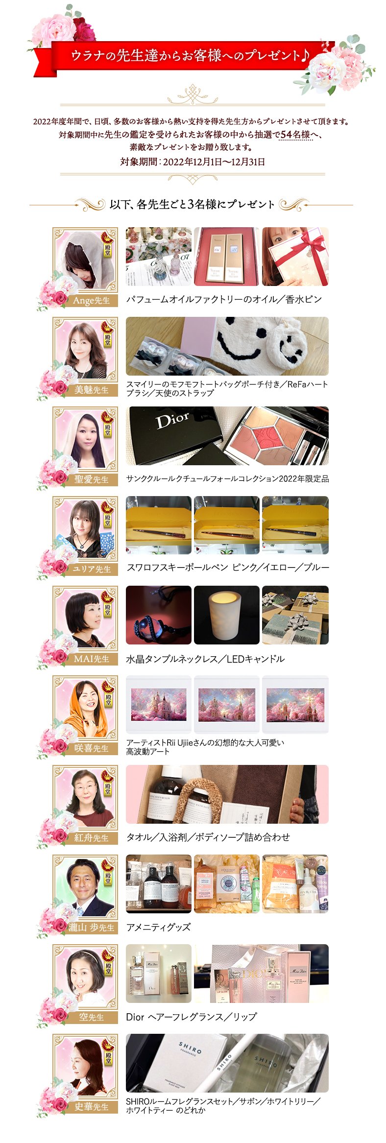 対象期間中に上記先生の鑑定を受けられたお客様の中から抽選で54名様にその先生からのプレゼントを差し上げます。