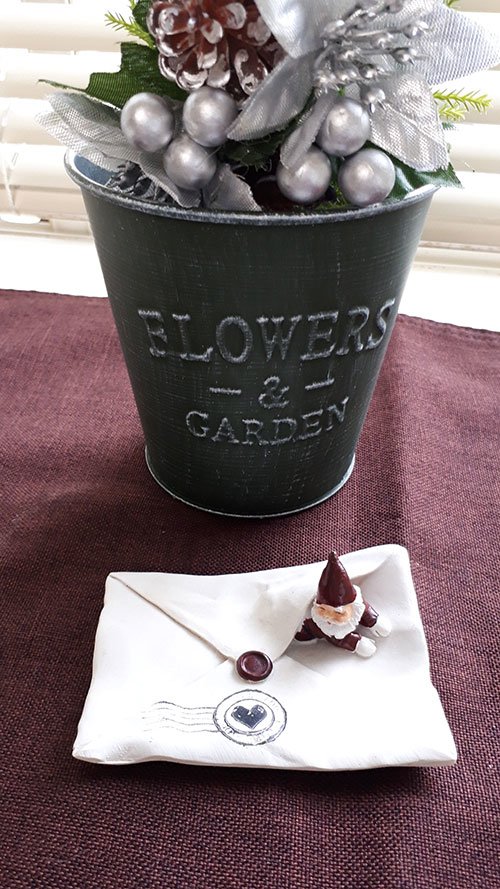 季節感のある物もその時期の運気が吸収できるので取り入れています。写真の中では陶器でできている封筒の上のサンタさんとゴールドクレストです。